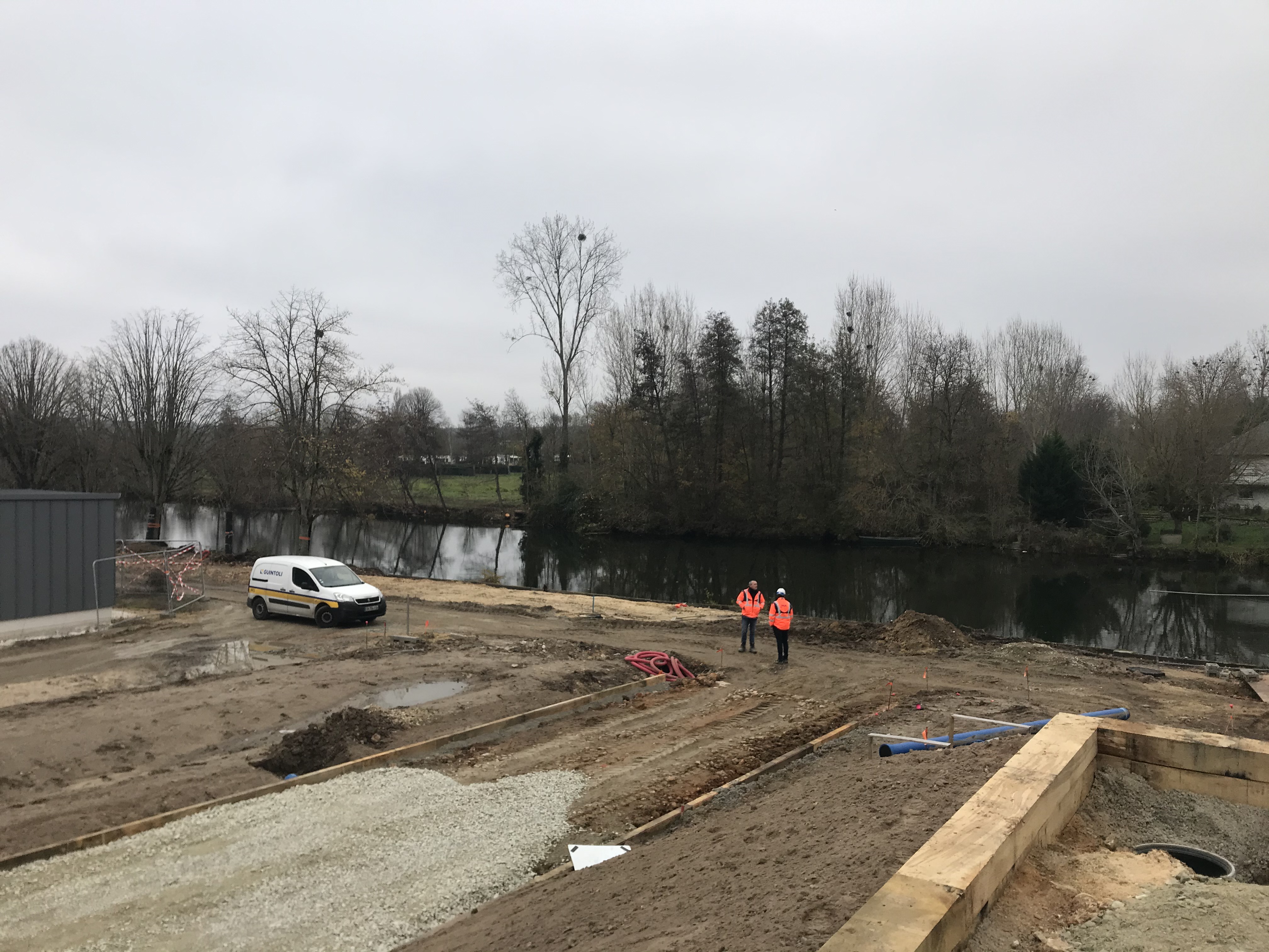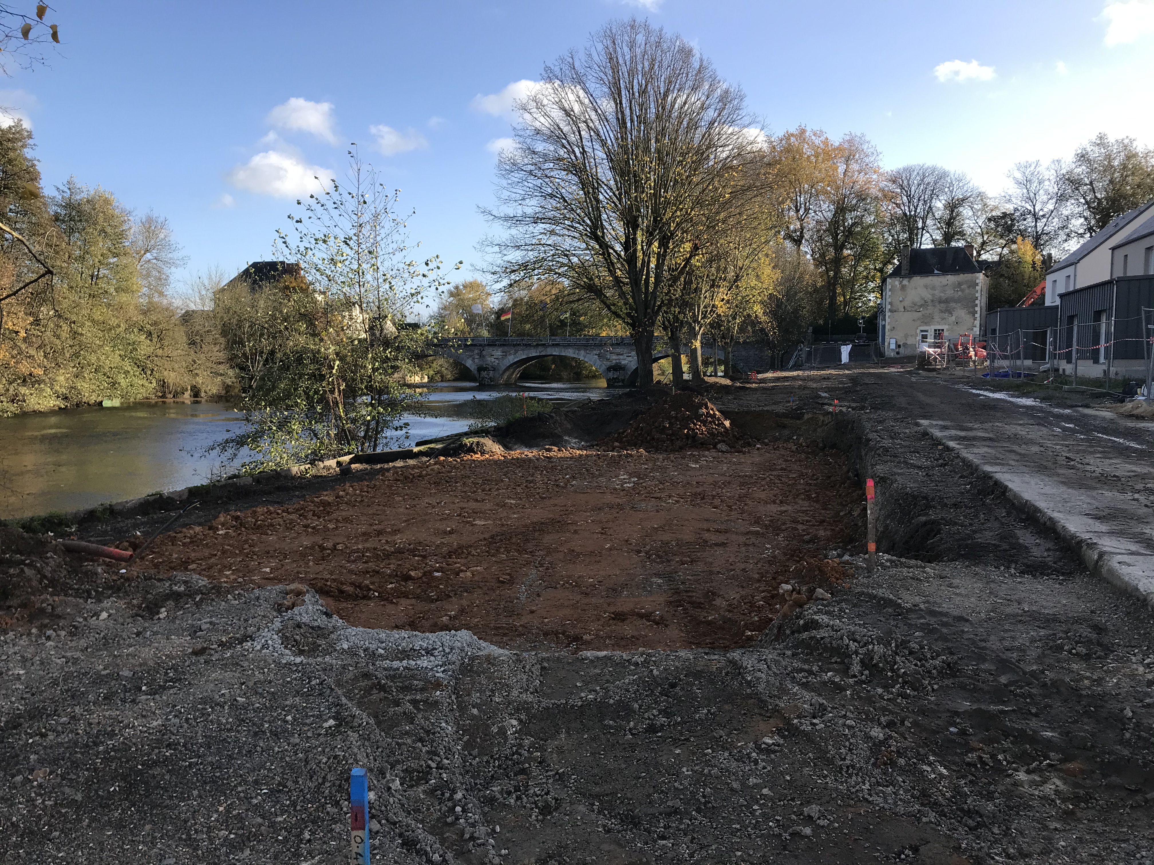 Le chantier de reconquête des berges est lancé au Lude. En visant entre les gouttes, les pelles ont déjà commencé à remodeler le site.